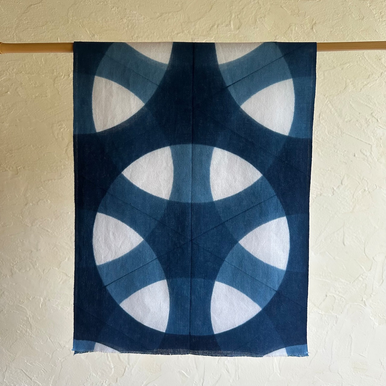 木綿100%の布に一枚一枚絞りを施し、藍で染め上げております