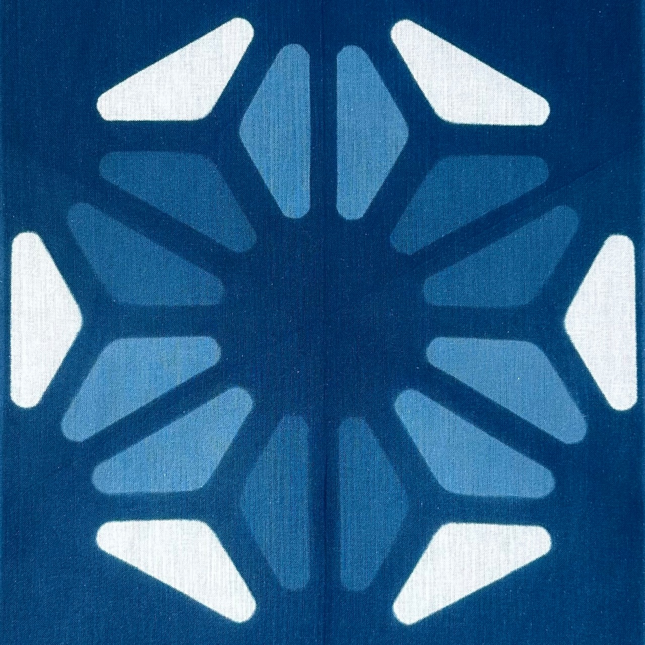 木綿100%の布に一枚一枚絞りを施し、藍で染め上げております