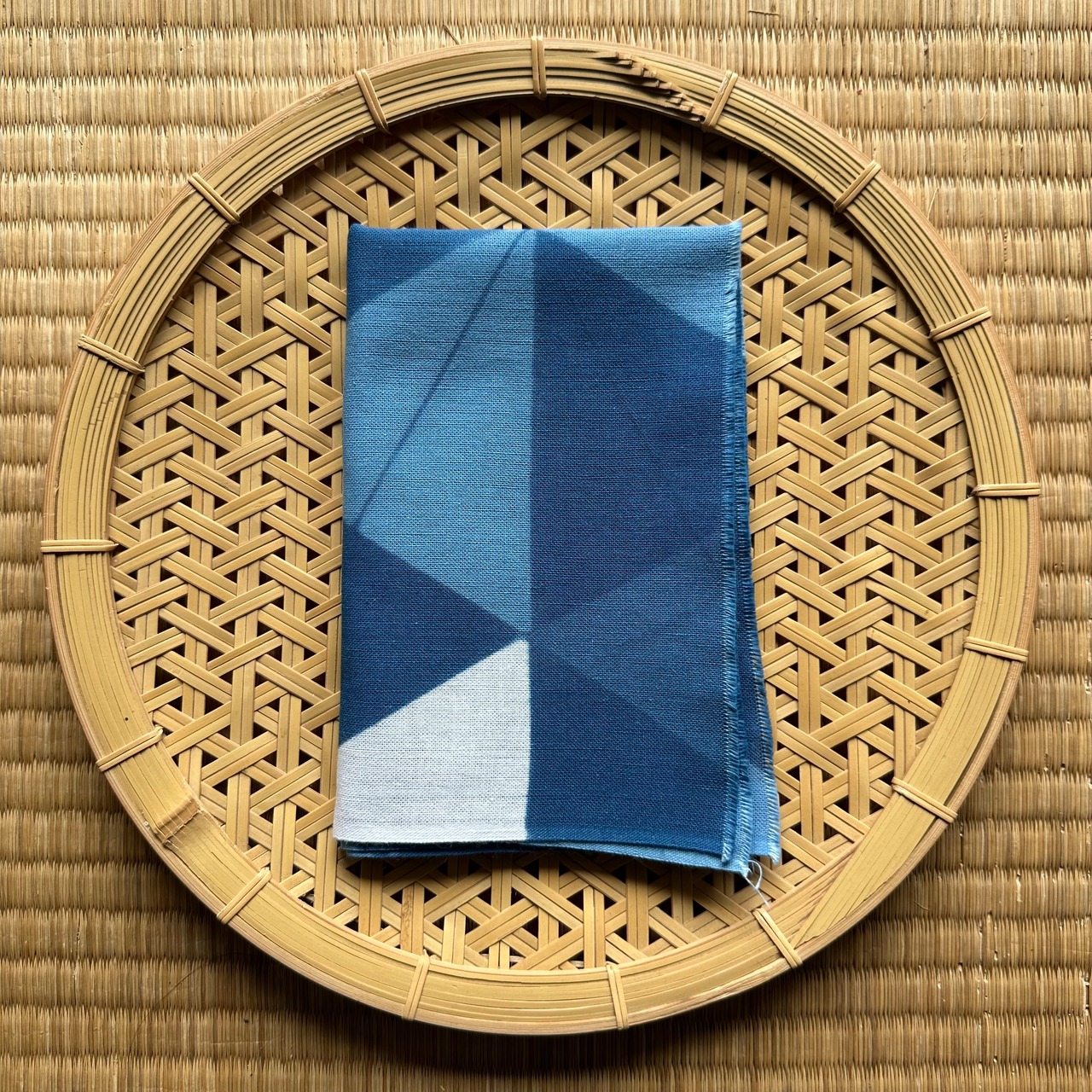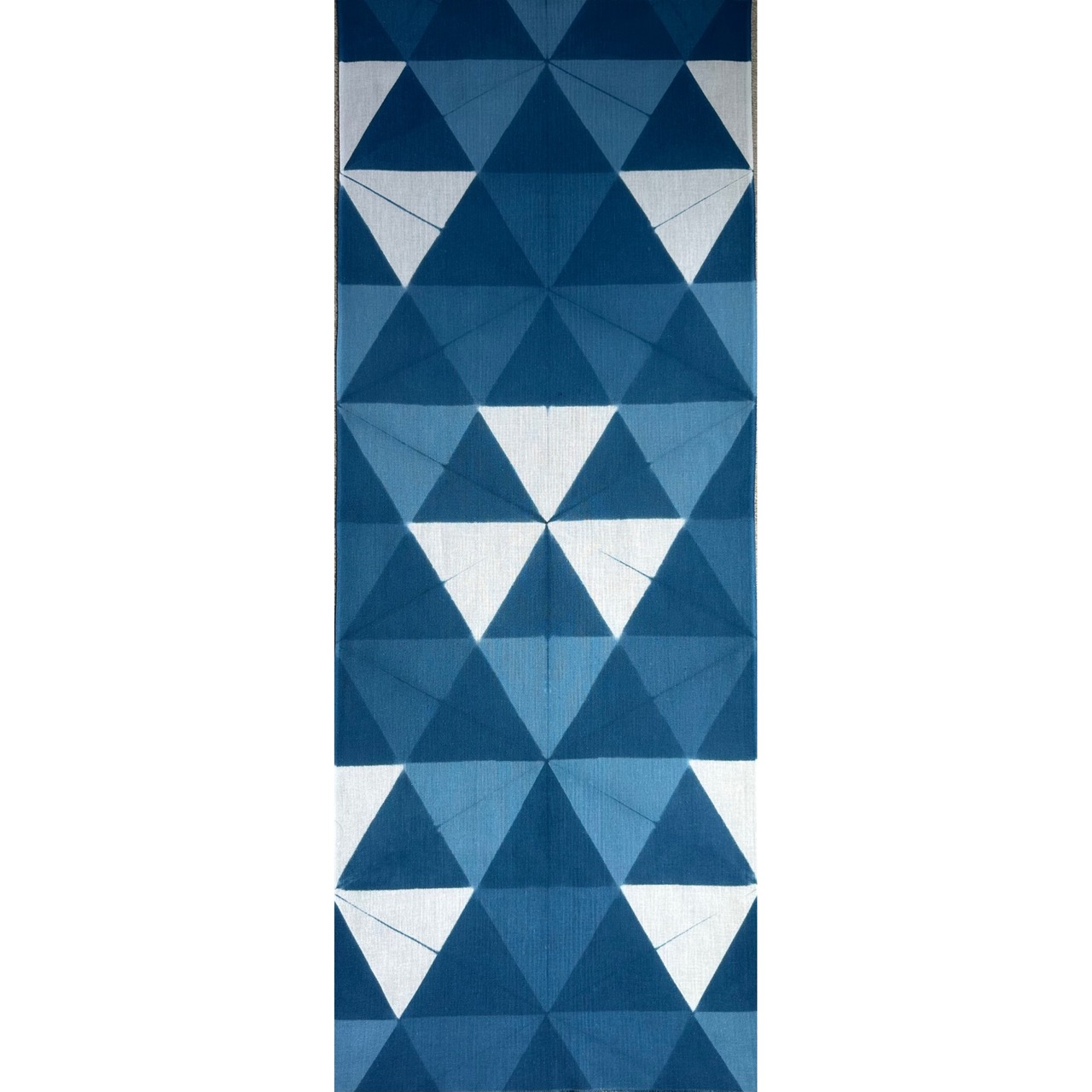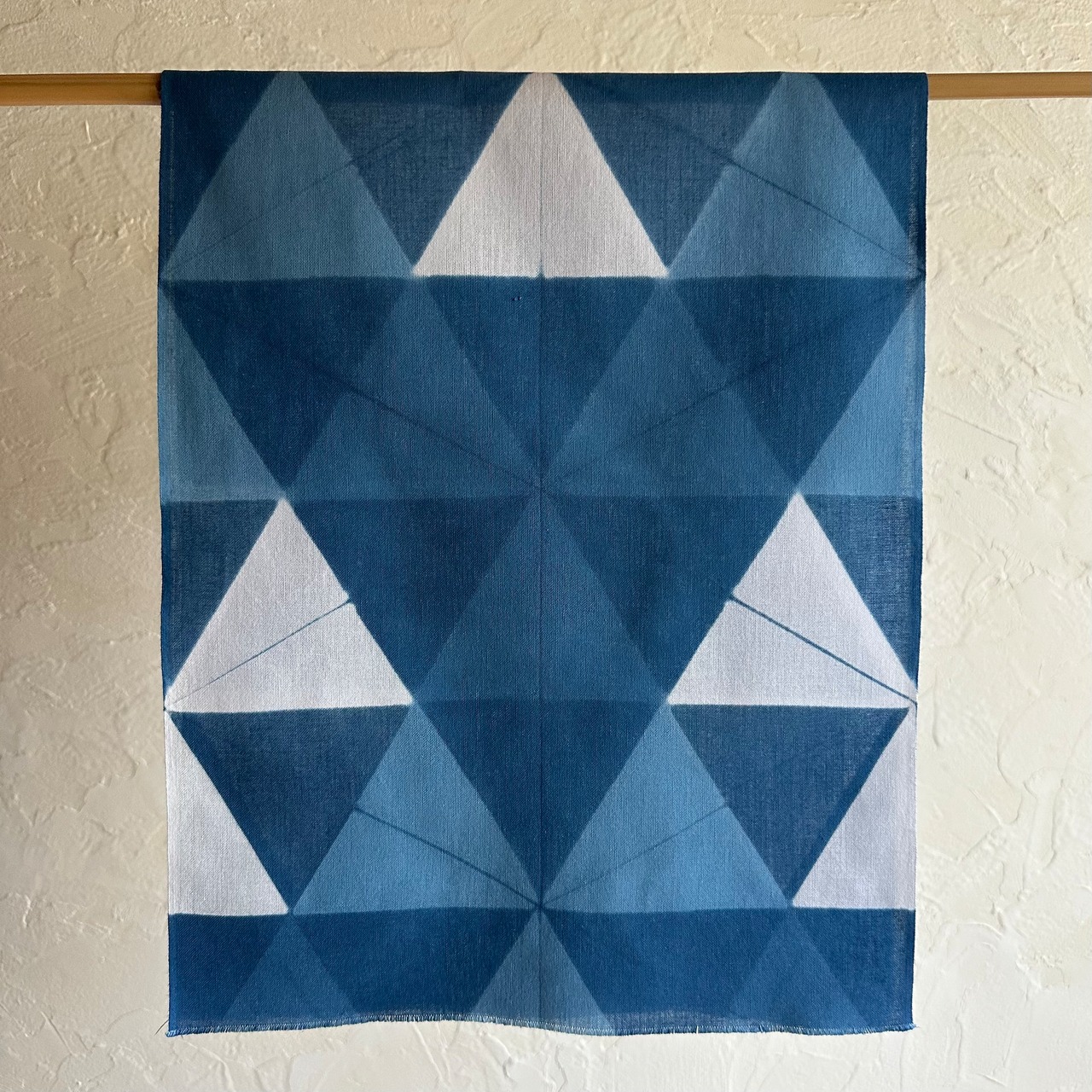 六芒星をイメージしながら、小さな三角形を藍の濃淡四色で染め分ける事で柄を表現しました