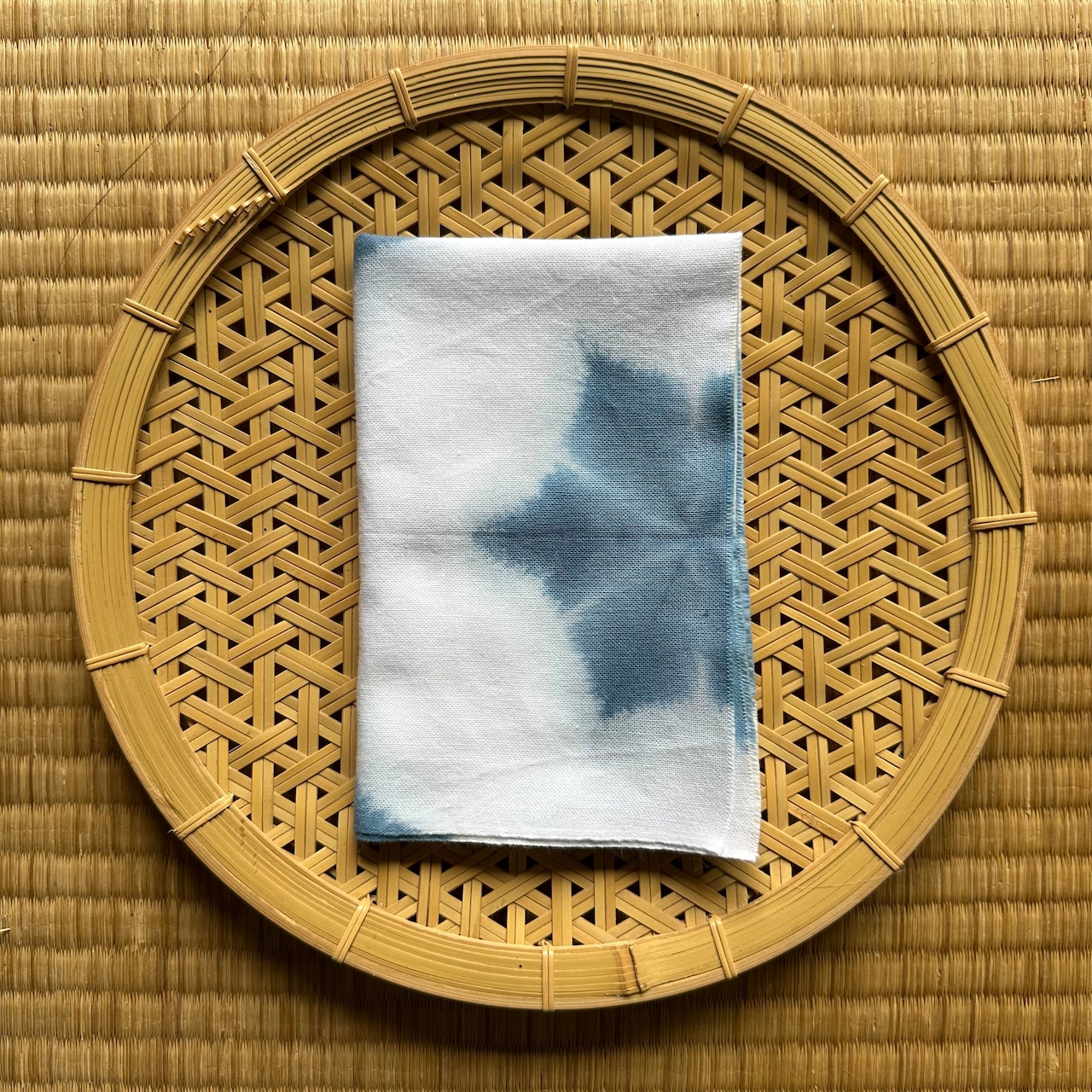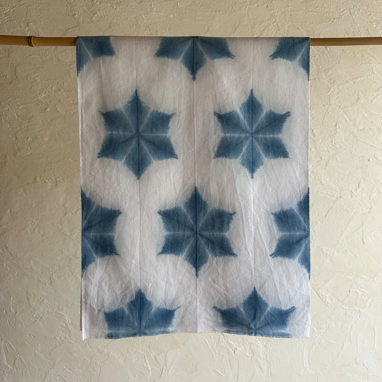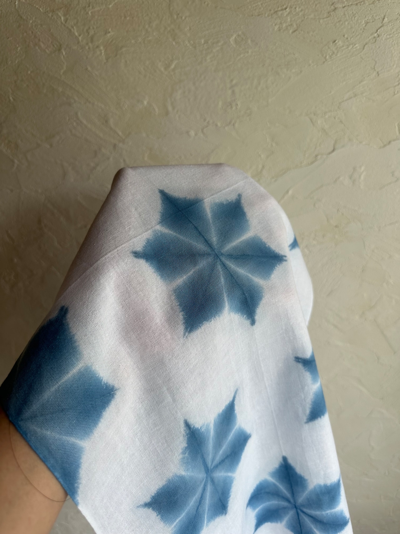 木綿100%の布に一枚一枚絞りを施し、藍で染め上げております