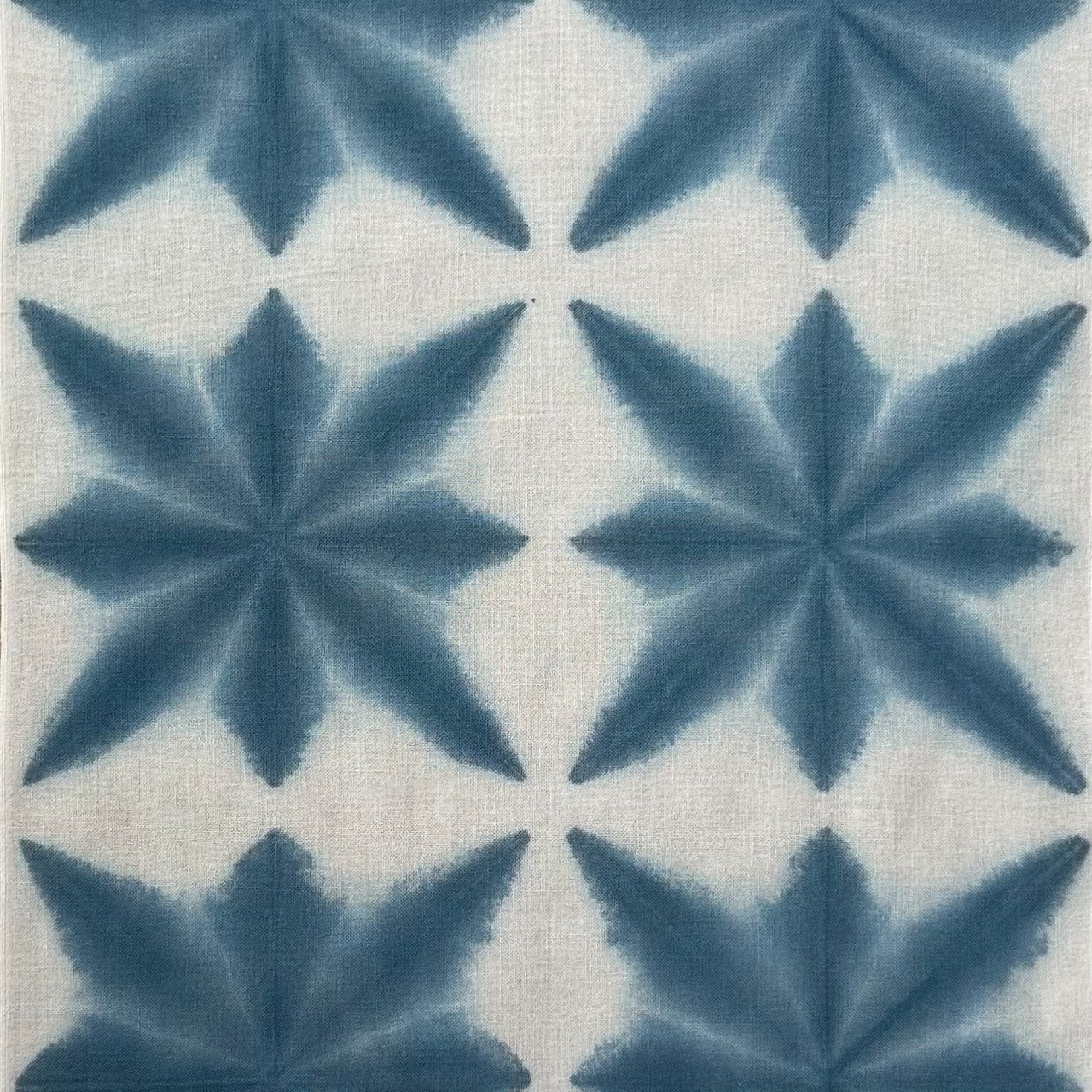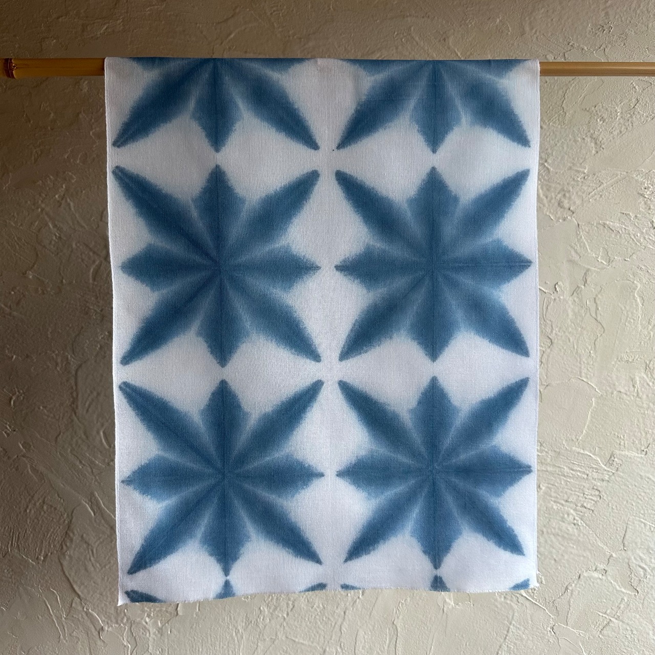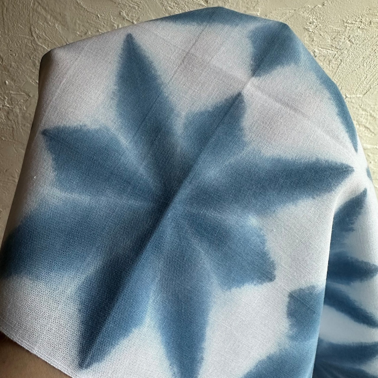 木綿100%の布に一枚一枚絞りを施し、藍で染め上げております